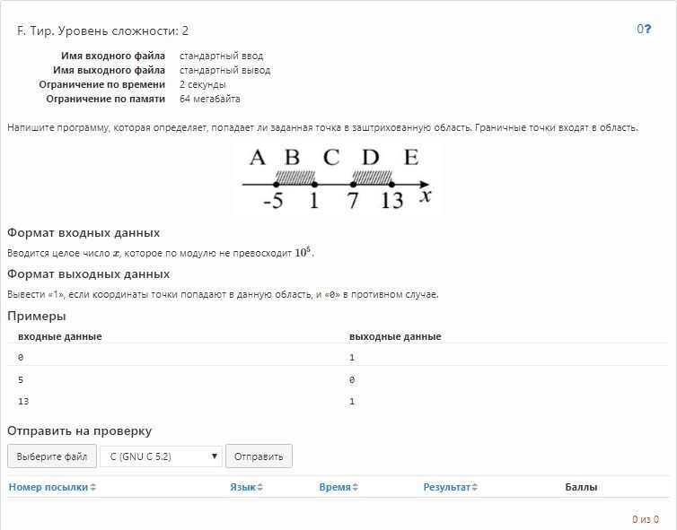 Имя выходного файла стандартный вывод Ограничение по времени 2 секунды Ограничение по памяти 64 мегабайта Напишите программу, которая определяет, попадает ли заданная точка в заштрихованную область. Граничные точки входят в область. Формат входных данных Вводится целое число x, которое по модулю не превосходит 105. Формат выходных данных Вывести «1», если координаты точки попадают в данную область, и «0» в противном случае. Примеры входные данные выходные данные 0 1 5 0 13 1