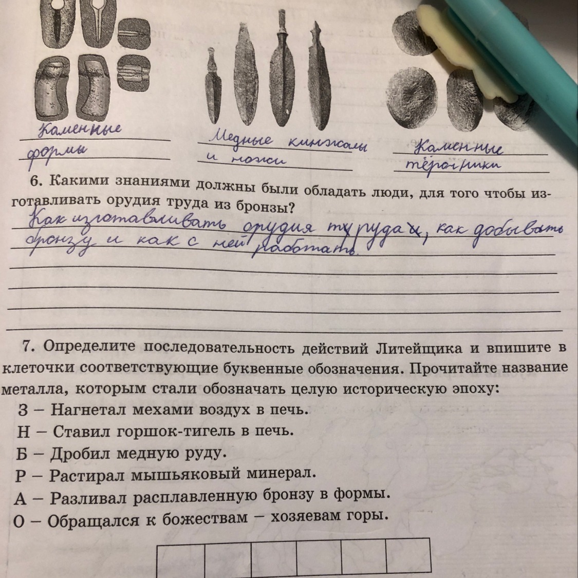 Бронза ,Б-Дробил медную руду ,Р-Растирал расплавленную бронзу в формы.,О-Обращался к божествам -хозяевам горы ,Н-Ставил горшок в тигель в печь ,З-Нагнетал мехами воздух в печь,А-Разливал расплавленную бронзу в формы.Ответ БРОНЗА бронзовая эпоха