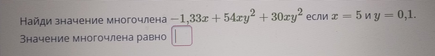 -1,33x+54xy^2+30xy^2 если x=5 и y=0.1. Значение многочлена равно...
