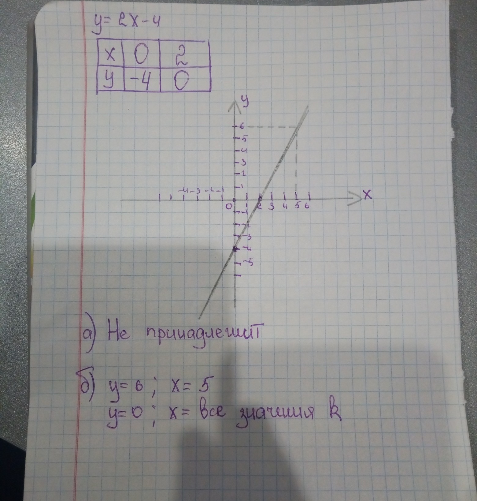 построить график функции у=2х-4. а)принадлежит ли графику точка А(-20;-70) б)Указать с помощью графика значение х,при котором. у=6, у=0