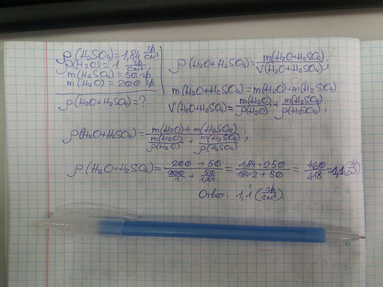 Определить плотность раствора серной кислоты, состоящей из 200 грамм воды и 50 грамм сереой кислоты. Плотность воды и серной кислоты найти в таблице.