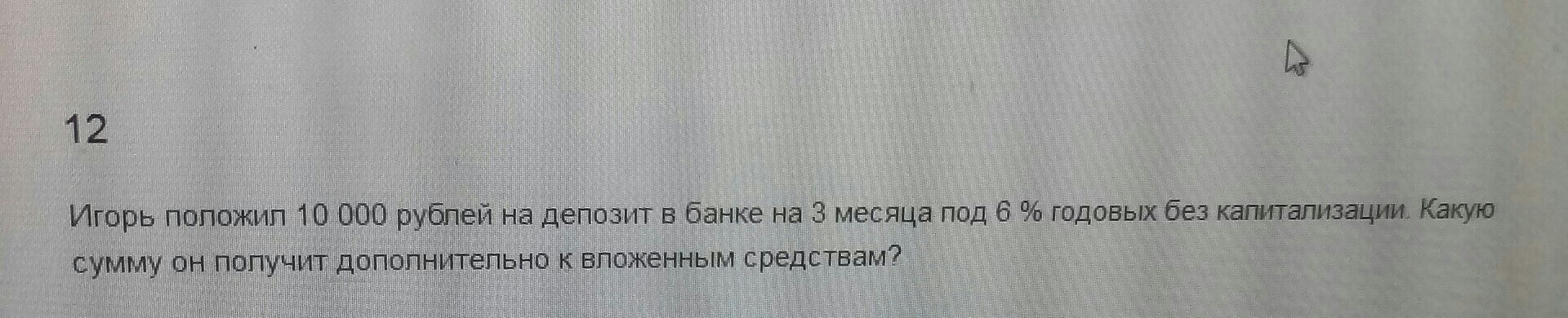 Игорь положил 10000 рублей на депозит в банке на 3 месяца под 6% годовых без капитализации. какую сумму он получит дополнительно к вложенным средствам.