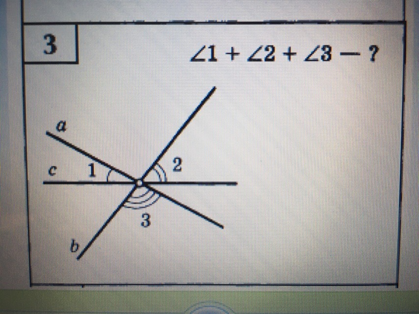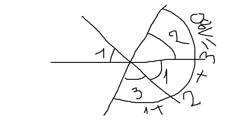 Отмеченные на рисунке углы 1 равны потому что вертикальные. углы 1, 2, 3 складываются в развернутый угол и их сумма равна 180.