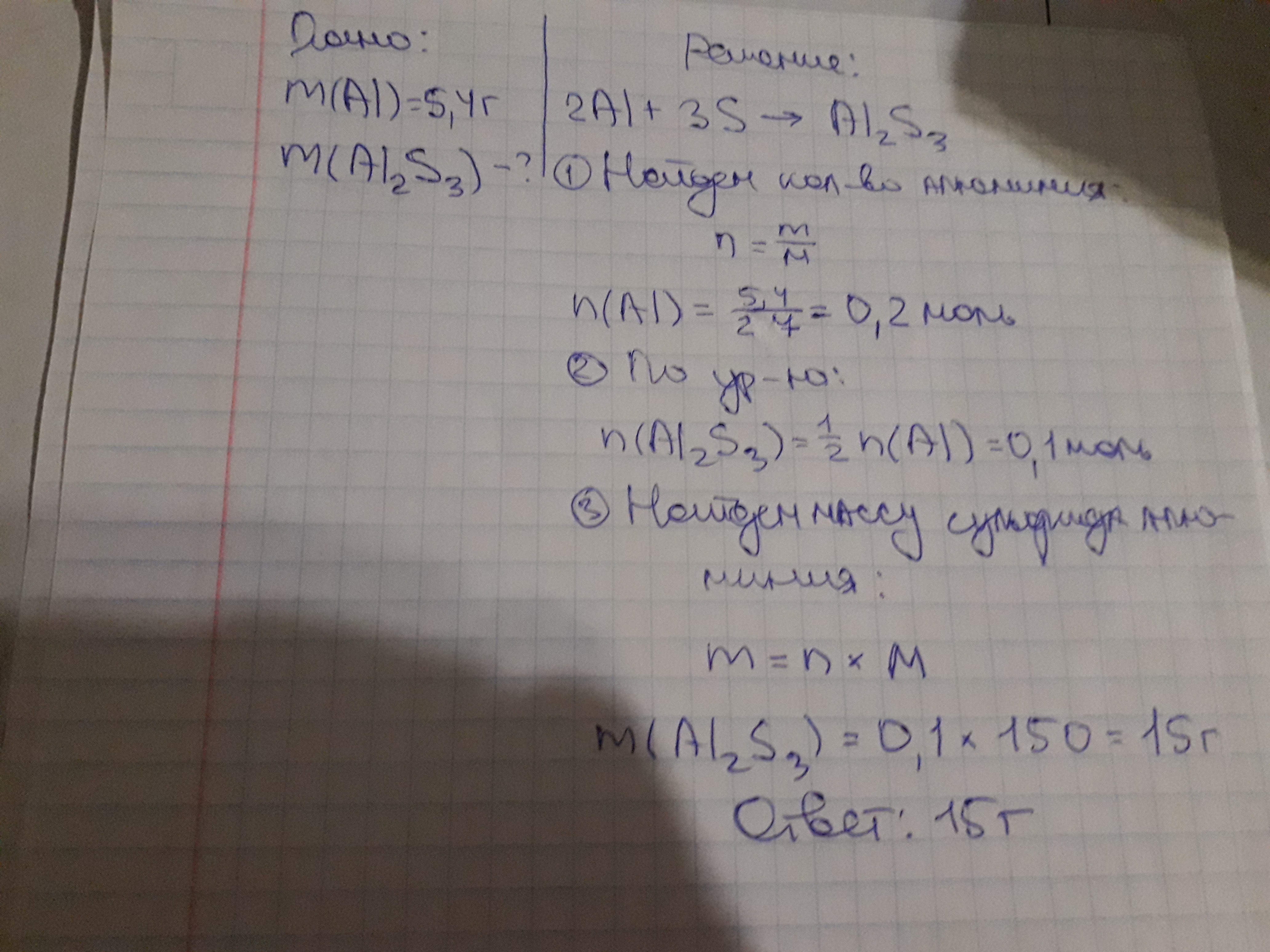 По уравнению хим. Реакции 2Аl+3S=AlS найдите массу сульфида алюминия, образовавшегося из 5,4 г алюминия