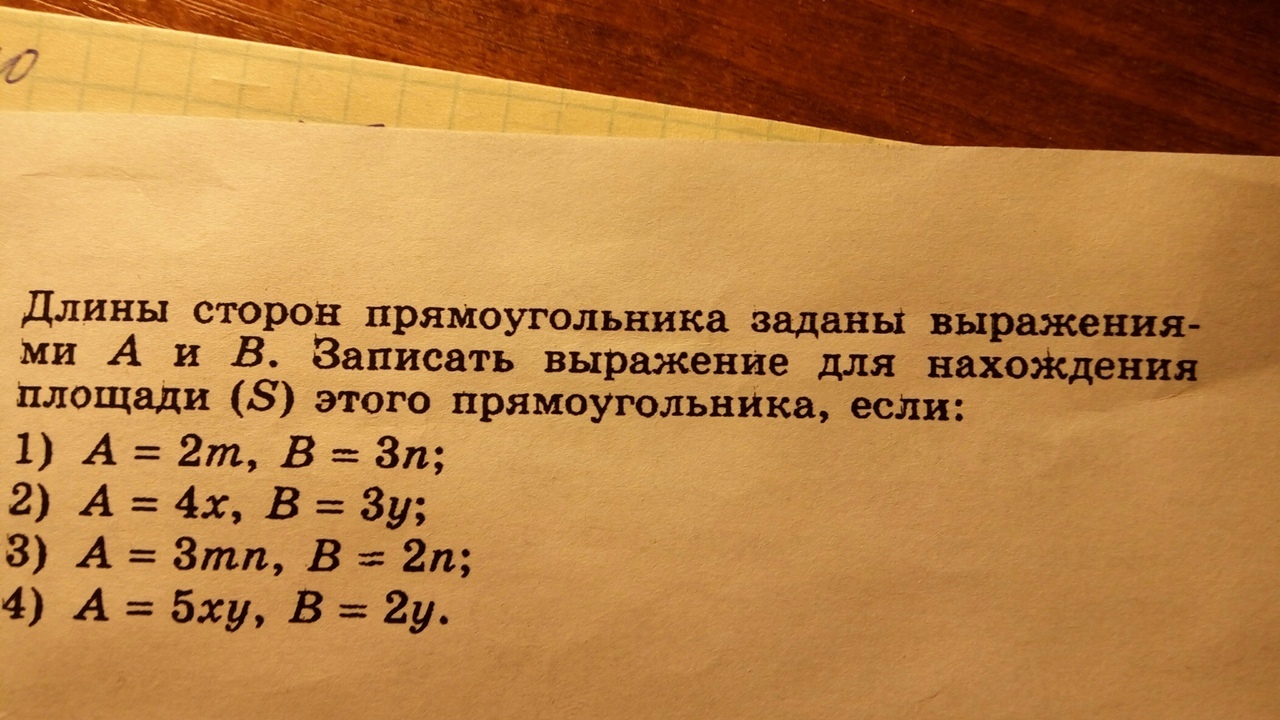 Площадь прямоугольника находится по формуле S = A * B, где S - площадь, A и B - стороны прямоугольника. Нужно просто-напросто подставить вместо A и B соответствующие выражения: