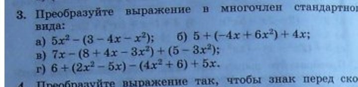 в)7x-(8+4x-3x^2)+(5-3x^2)=(раскрываем скобки)7x-8-4x+3x^2+5-3x^2=(приводим подобные)3x-3