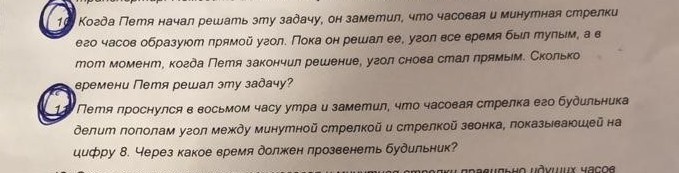 12. Ответ: Осталось 24 мин, так как на часах 7:36. Это положение стрелок удовлетворяет условию, поскольку часовая равноотстоит на 12° от стрелки на 8 и от минутной на 36 мин.