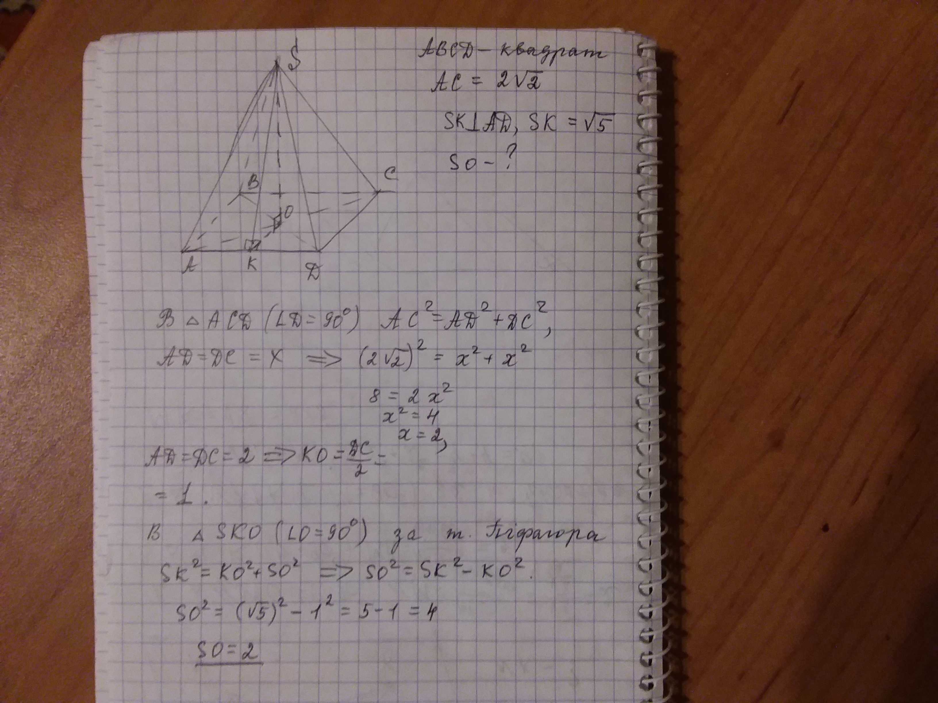 Допоможіть!Точка S рівновіддалена від кожної сторони квадрата ABCD ,діагональ якого дорівнює 2 корінь квадратний з 2 .Знайдіть відстань від точки S до площиниABC,якщо відстань від точки S до сторони AD дорівнює корінь квадратний з 5