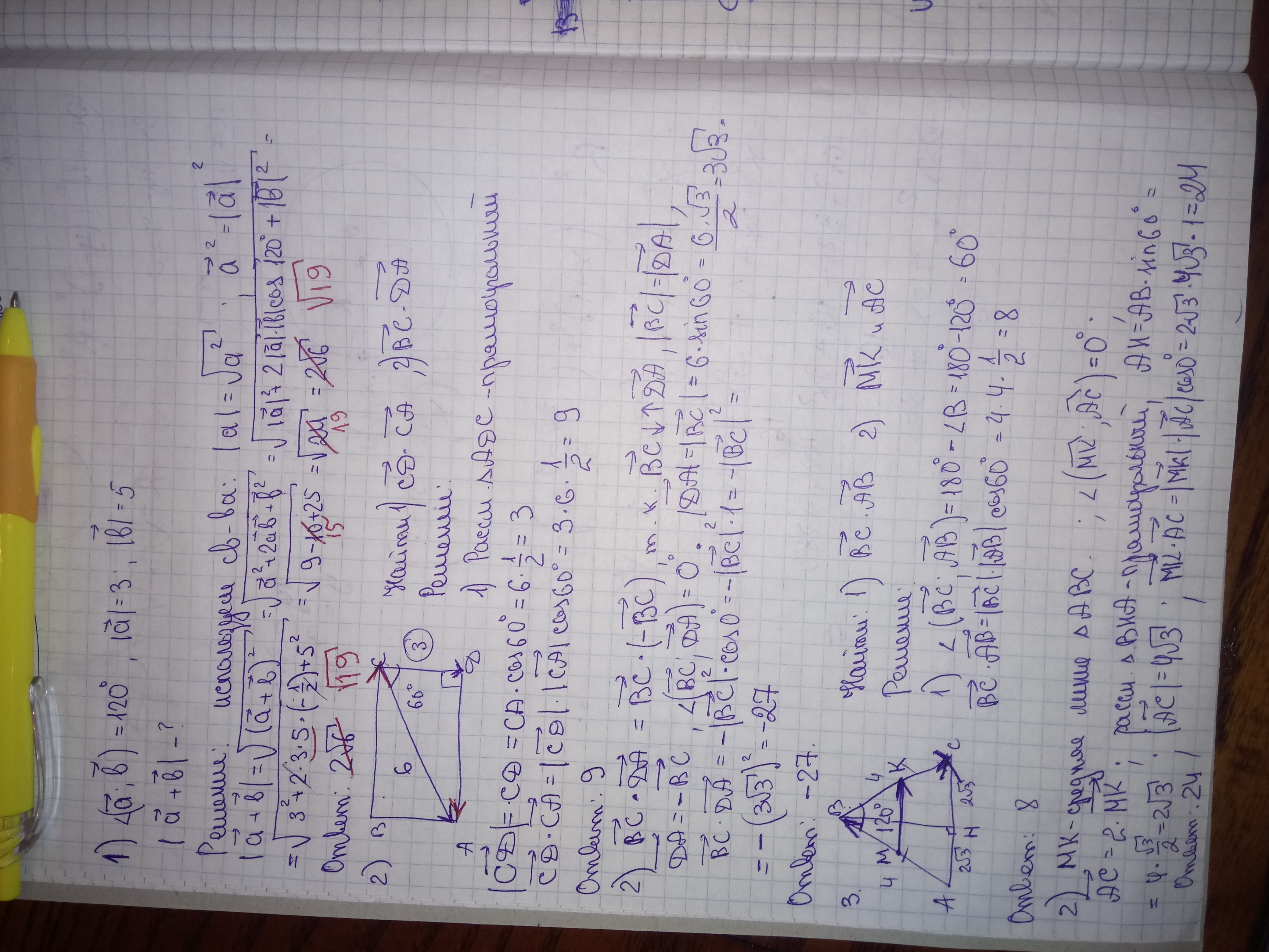3) В равнобедренном треугольнике АВС АВ=ВС=4, угол В=120°, М и К-середины АВ и ВС соответственно. Найдите скалярное произведение векторов ВС и АВ; МК и АС.
