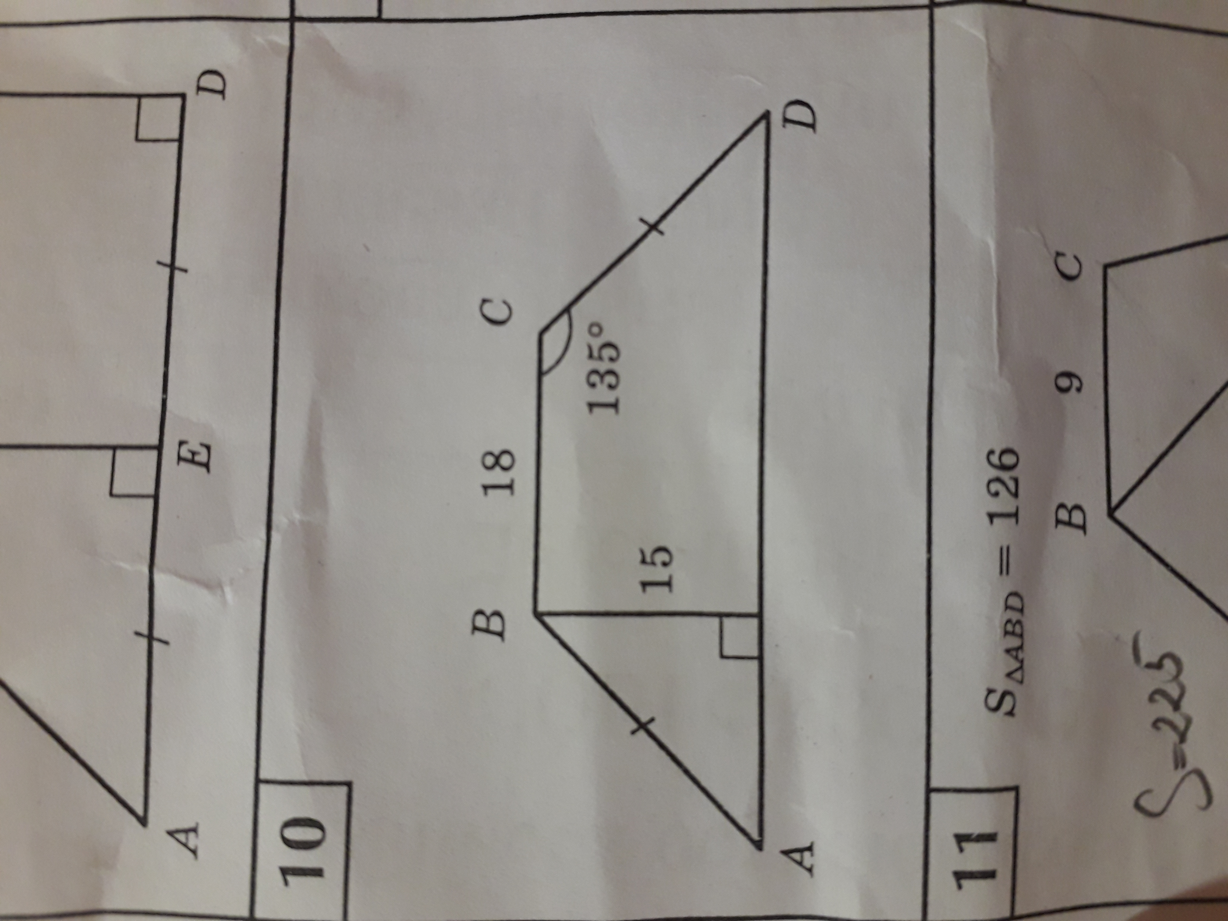 Решение:1)т.к.ab=cd=>ABCD-р/б трапеция=>угол BCD=углуABC=135град.т.к.B(допустим)H-высота=>уголABH=135-90=45град.=>уголBAH=180-90-45=45(по теореме о сумме углов треугольника)=>треугольникABH-р/б.Значит,BH=AH=15см.2)Проведём высоту C(допустим)F.треугольникиABH и CDF равны.Значит FD=15 см.AD=18+15+15(т.к.BC=HF)=48см.S abcd=1/2×(18+48)×15=480см2.