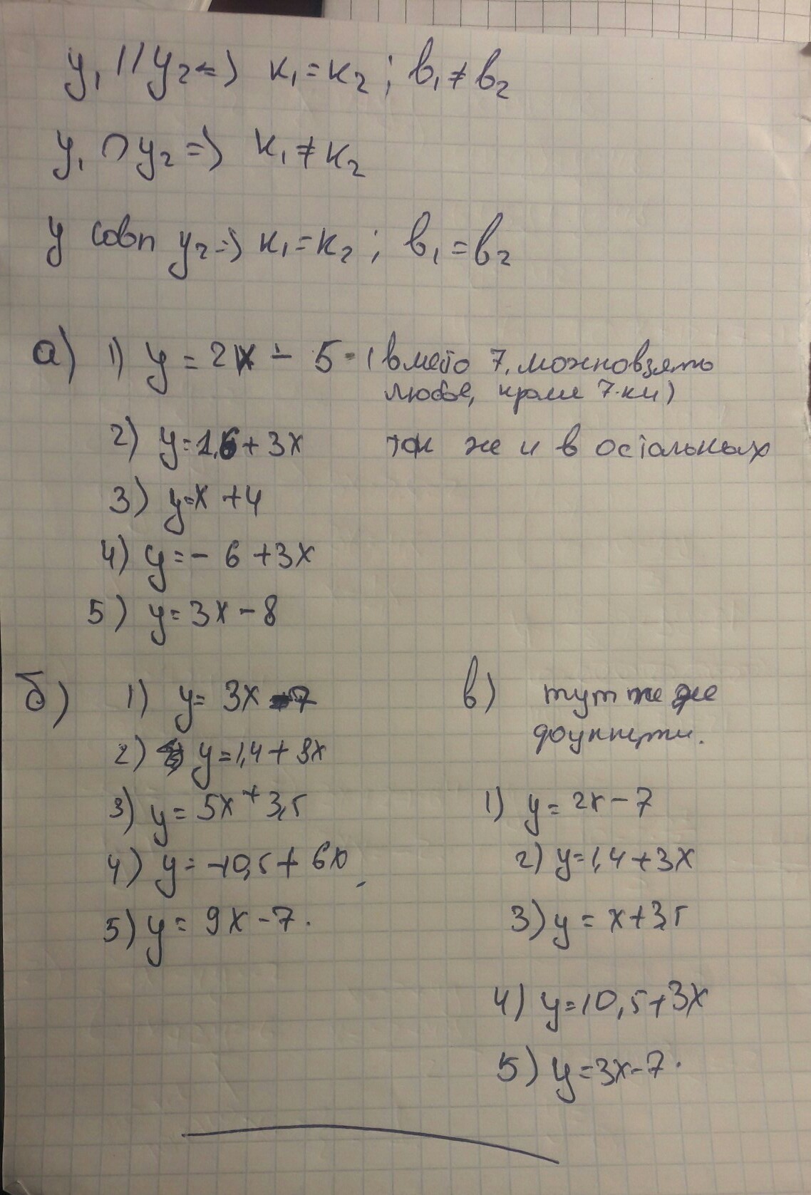 Алгебра 7 класс 23.3. Для линейной функции: 1) y=2*x-7, 2)y=1,4+3*x, 3)y=x+3,5, 4)y= - 10,5+3*x, 5)y=3*x-7 указать функцию. график которой: а) параллелен графику данной функции б) пересекает график данной функции в) совпадает с графиком данной функции
