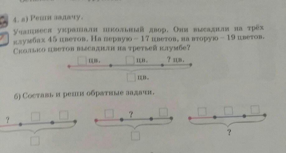 б) 1)всего посадили 45 цветов на вторую посадили 19,а на третью 9. сколько посадили на первую? первая=45-19-9=17