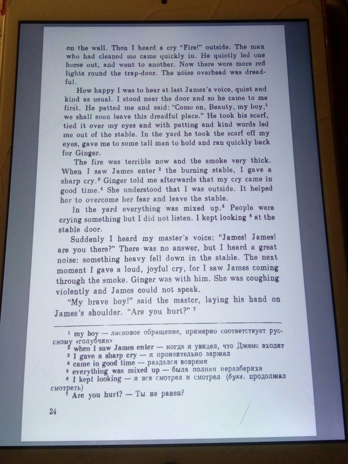 на стене. Потом я услышал крик «Огонь» снаружи. Человека, который быстро очистил меня. Он тихо вывел одну лошадь и пошел за другой. Теперь вокруг люка были красные огни. Шум над головой был ужасен. Как я был счастлив услышать, наконец, голос Джеймса, тихий и добрый, как обычно. Я стоял у двери, и он сначала обратился ко мне. Он погладил меня и сказал: «Пойдем, красивый, мой мальчик, мы скоро покинем это ужасное место». Он взял свой шарф, привязал его к моим глазам, и ласково с добрыми словами вывел из конюшни. Во дворе он снял с меня повязку, дал ее высокому мужчине, чтобы держать ее, и я быстро побежал к Джинджер. Теперь огонь был ужасным, и дым очень толстый. Когда я увидел, как Джеймс вошел в горящую конюшню, я пронзительно заржал. Джинджер сказал мне потом, что мой крик раздался вовремя. Она поняла, что я нахожусь снаружи, это помогло ей перебороть страх и покинуть конюшню. Во дворе была полная неразбериха. Люди что-то кричали, но я не слушал. Я продолжал смотреть на дверь конюшни. Внезапно я услышал голос моего хозяина: «Джеймс, Джеймс, ты там?» Не было никакого ответа, но я услышал большой шум: что-то тяжелое упало в конюшне. В следующий момент я произнес громкий, радостный крик, увидев, как Джеймс прошел сквозь дым. Джинджер был с ним. Она сильно кашляла, и Джеймс не мог говорить.