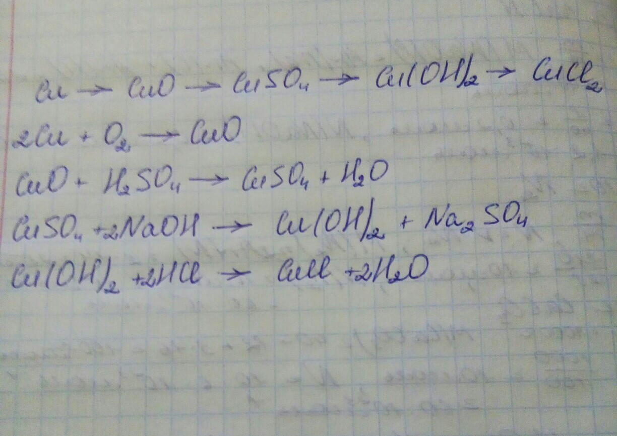 запишите все уравнения с помощью которых можно осуществить превращения cu-cuo-cuso4-cu(oh)2-cucl2