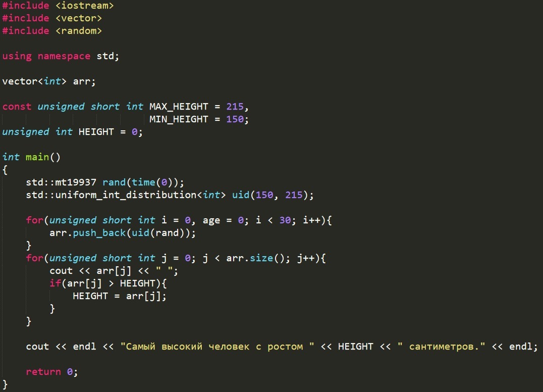 Определить самого высокого ученика в классе, если известно что в классе 30 человек, рост каждого ученика вводиться случайными числами из диапазона от 150 до 215 сантиметров.