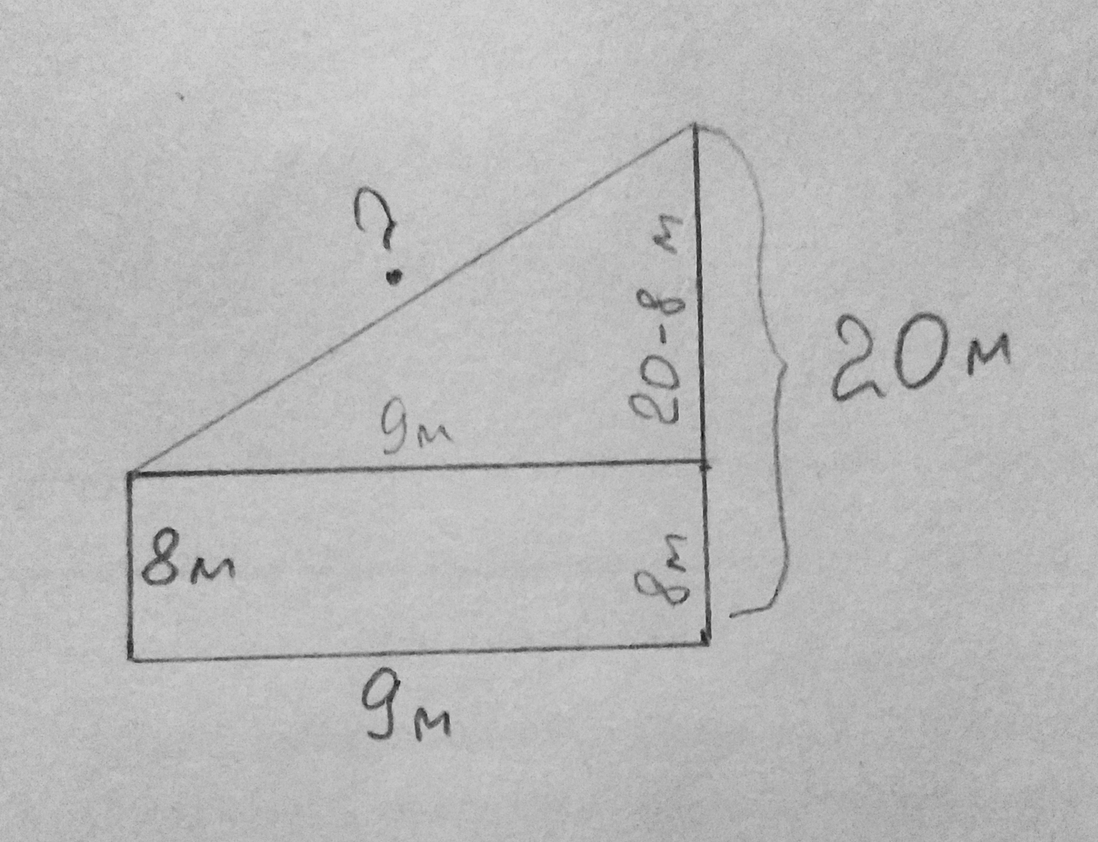 Восьмиметровый телефонный столб находиться на расстоянии 9 м от дома. Какой длины, самое меньшее, должен быть телефонный кабель, протянутый от верхушки столба в точку, расположенную на стену дома на высоте 20 м от земли?