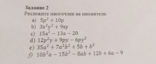 f) (10b^2а-15b^2)+(12b-8аb)+(6а-9) = 5b^2(2а-3)-4b(2а-3)+3(2а-3) = (2а-3)(5b^2-4b+3)
