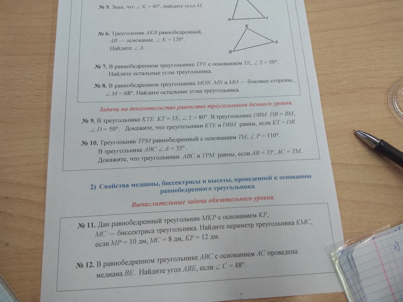 (1. 180-68=112; 2.112÷2 =56; Ответ: 68°, 56°, 56°; Номер 10.(1.так как сторона и основание равны, то и 3 сторона треугольников равна.А если стороны и углы равны, то и треугольники равны.Ответ:ТМР = АВС. Номер 12 (1.Если угол С = 48°, то и угол А равен 48°, так как он равнобедренный 2. 48+48=96; 3. 180-96 =84°(угол В).а медиана является высотой.Ответ:угол АВЕ = 84°. Вроде бы так а так всё...