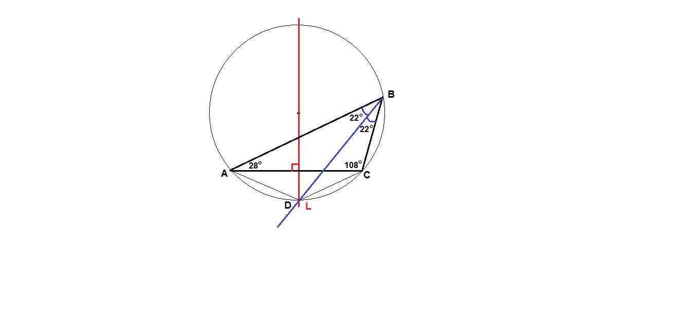 Углы A, B, C треугольника ABC равны 28,44 и 108 соответственно. Биссектриса угла ABC и серединный перпендикуляр к стороне AC пересекаются в точке D. Сколько градусов составляет угол ADC?