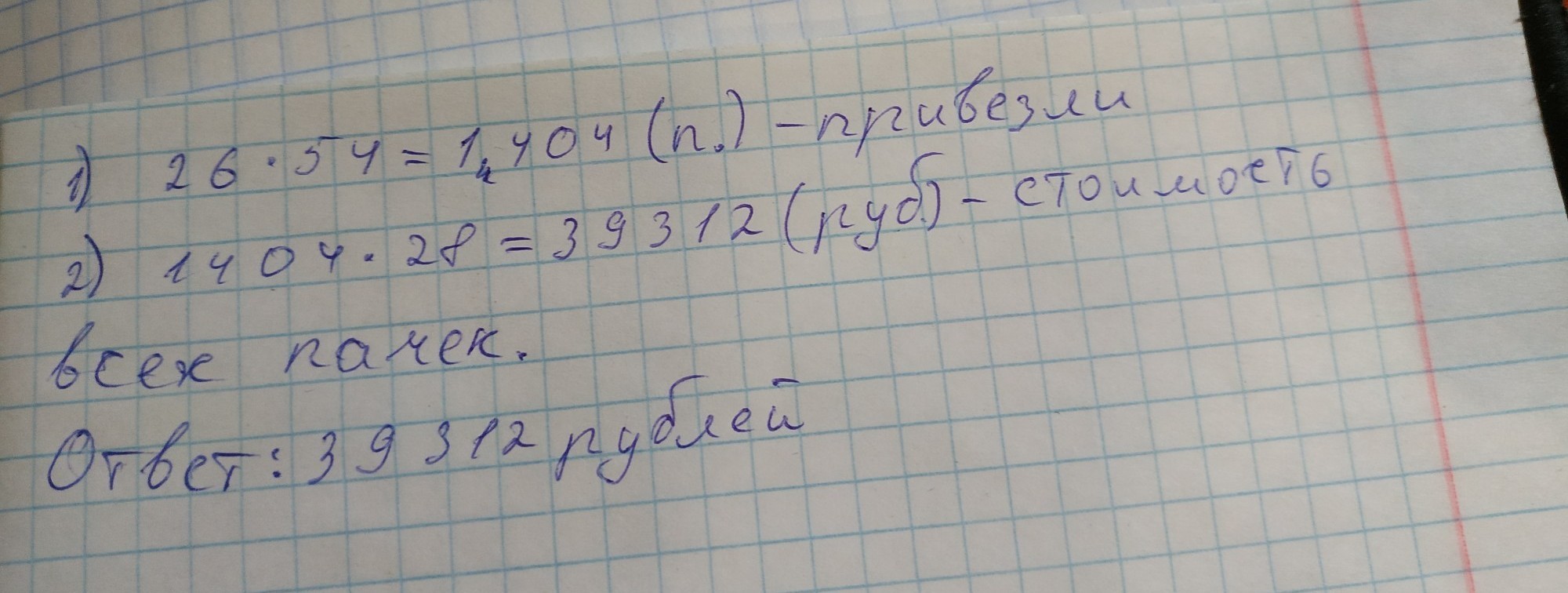 В магазин привезли 26 коробок печенья. В каждой коробке по 54 пачки. Какова стоимость всех пачек печенья,если цена пачки 28р.?
