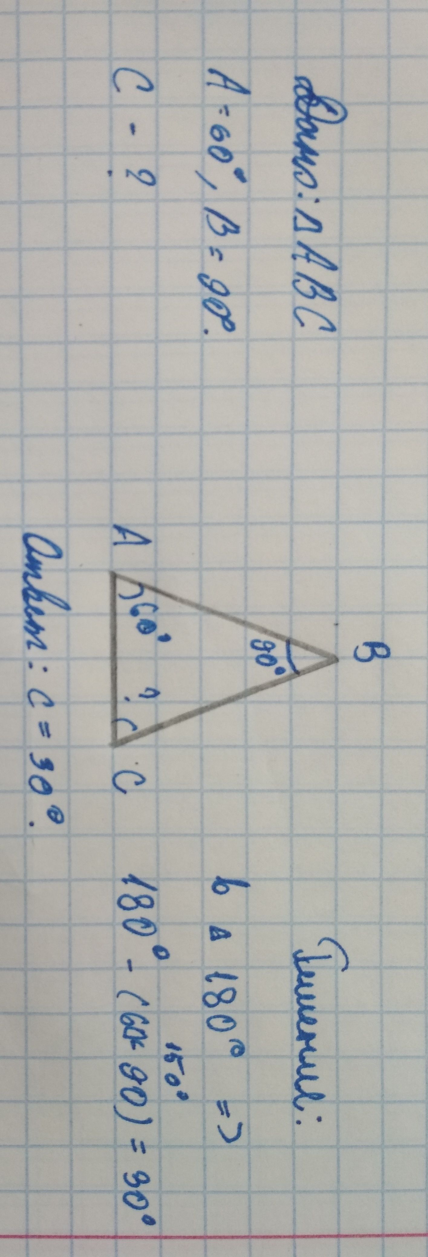 В твоём случае угол при вершине В прямым можно было нарисовать) и так как треугольник прямоугольный, пользоваться можно теоремой о сумме острых углов прямоугольного треугольника (это я к слову о своём "решении"
