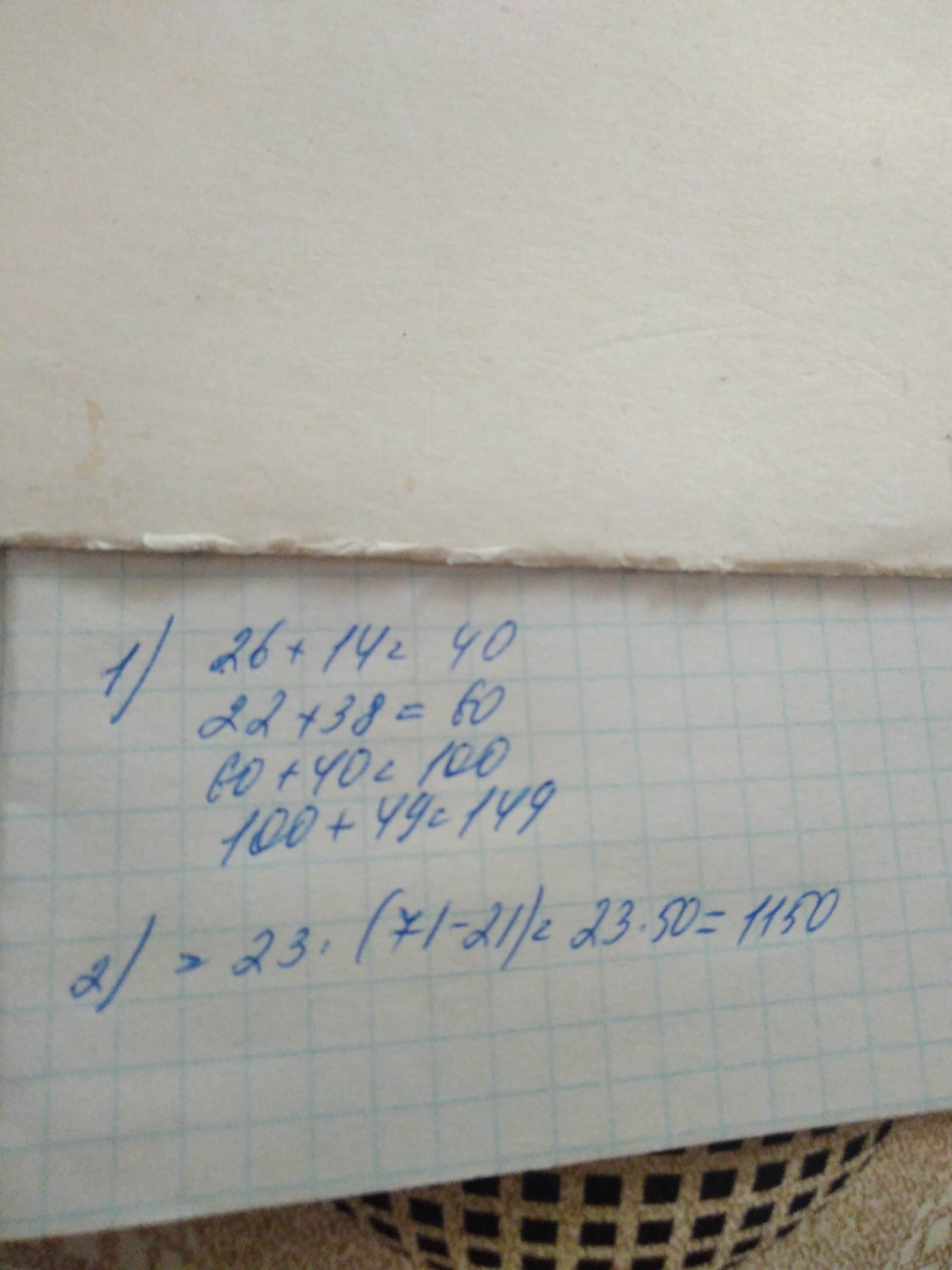 1.можно 14 и 26 сложить вначале. Затем 22 и 38. И то что получится сложи. К ответу прибавь 49.
