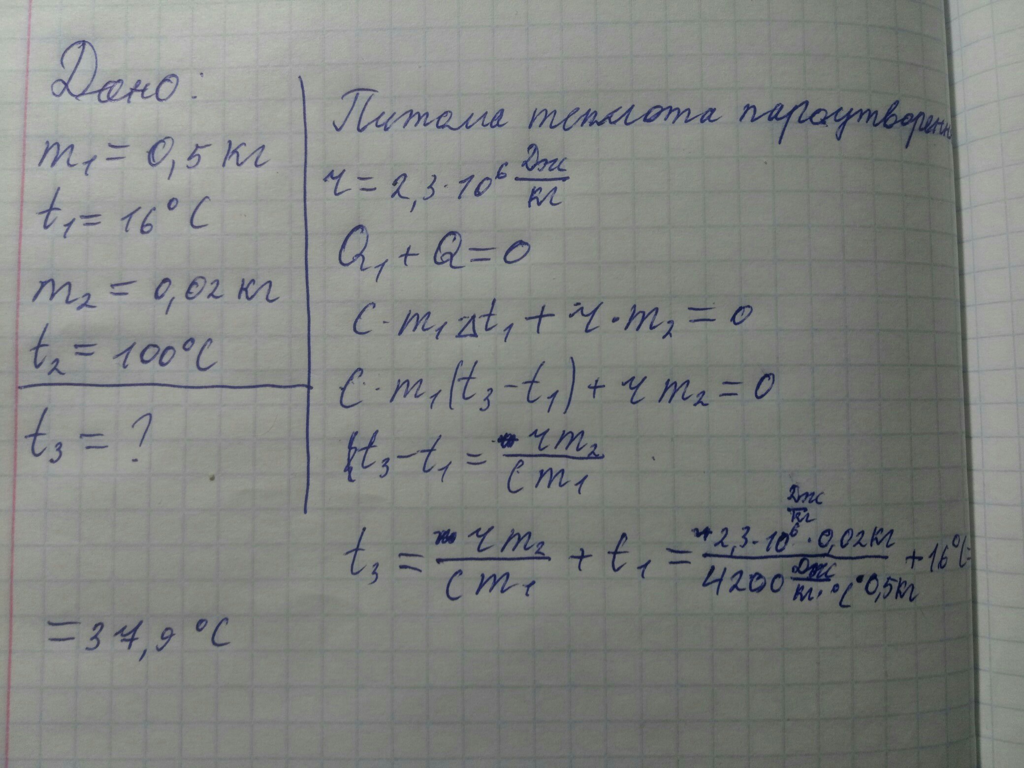 У калометрі міститься 0,5кг води при 16с° . У нього впускають 20 г. водяної пари при 100с°. До якої температури нагріється вода в результаті конденсації пари?