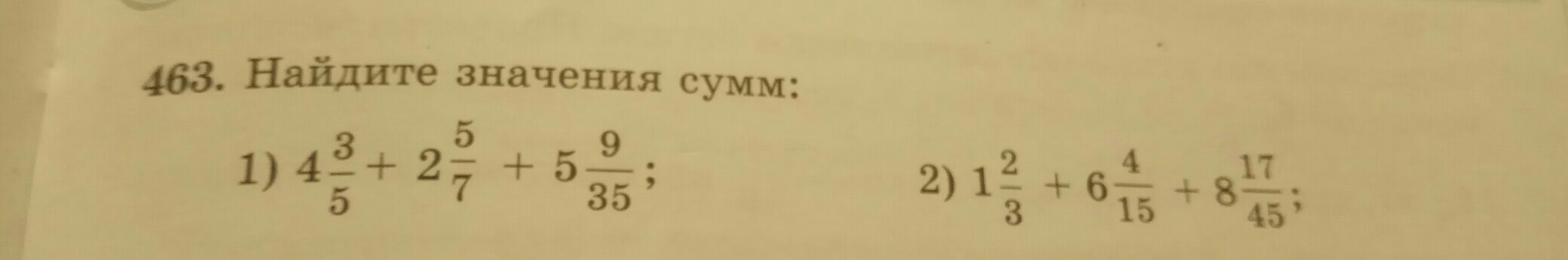 Шесть целых четыре пятнадцатых + восемь целых семнадцать сорокпятых = общий знаменатель 45, то есть шесть целых двенадцать сорокпятых + восемь целых семнадцать 45= четырнадцать целых двадцать девять 45.