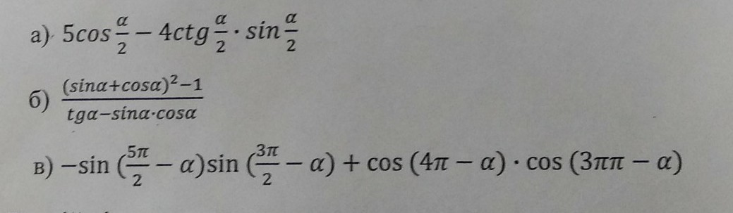 a) 5cos(a/2)-4ctg(a/2)sin(a/2)=5cos(a/2)-frac{4cos(a/2)sin(a/2)}{sin(a/2)}=\ \=5cos(a/2)-4cos(a/2)=cos(a/2)