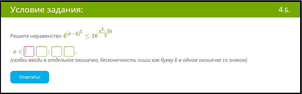 4^{(x-4)^2}<16^{frac{x^2-24}{2}}\\4^{(x-4)^2}<Big (4^2Big )^{frac{x^2-24}{2}}\\4^{(x-4)^2}<4^{x^2-24}\\x^2-8x+16<x^2-24\\-8x<-40\\x>5\\underline {xin (5,+infty )}