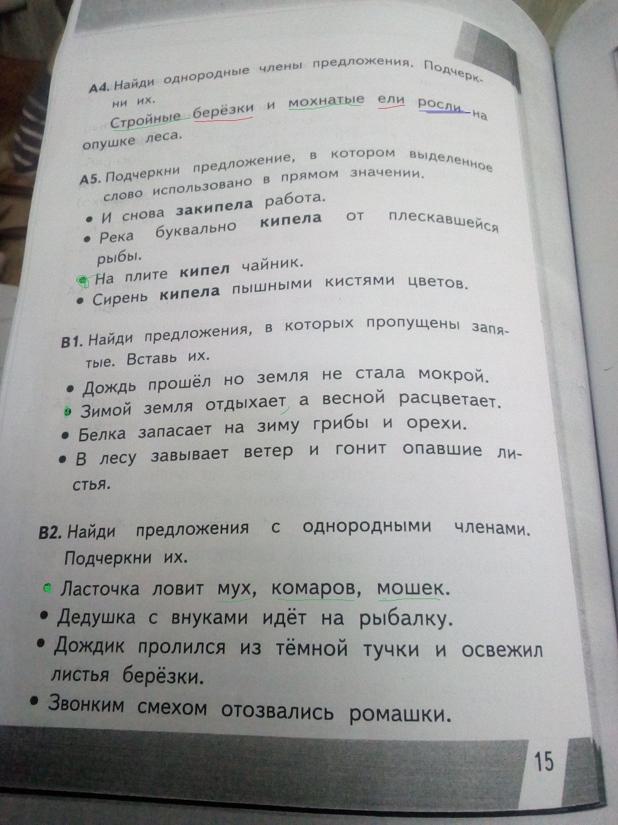 В2 - Ласточка ловит мух, комаров, мошек (мух, комаров, мошек - однородные, подчеркнуть _ _ _). Дождик пролился из темной тучки и освежил листья березки (пролился, освежил - однородные сказуемые).