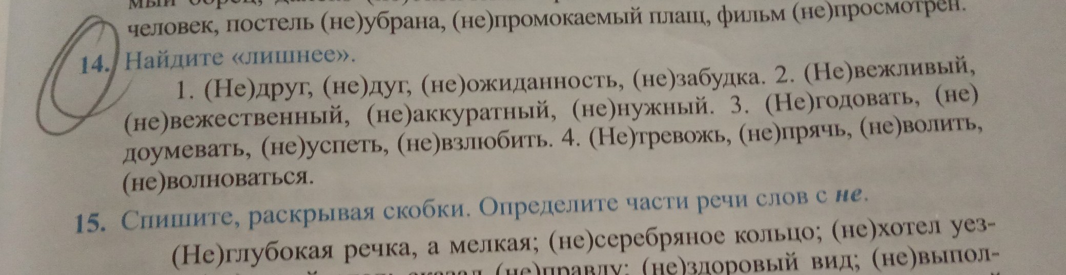 1. Недруг, недуг, неожиданность, незабудка. Лишнее слово - недруг. 2. Невежливый, невежественный, неаккуратный, ненужный. Лишнее слово - невежественный. 3. Негодовать, недоумевать, не успеть, невзлюбить. Лишнее слово - не успеть. 4. Не тревожь, не прячь, неволить, не волноваться. Лишнее слово - неволить.