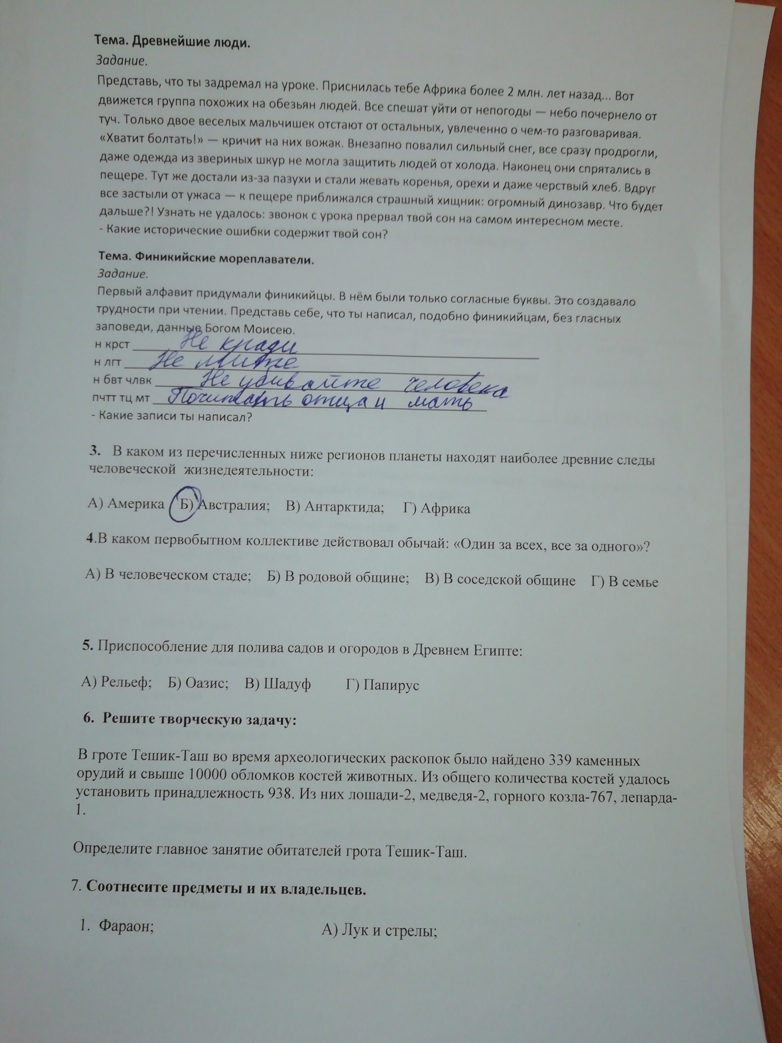 4 Б; 5 В; 6 ОХОТА в основном на козлов , лошадей изредко медведей