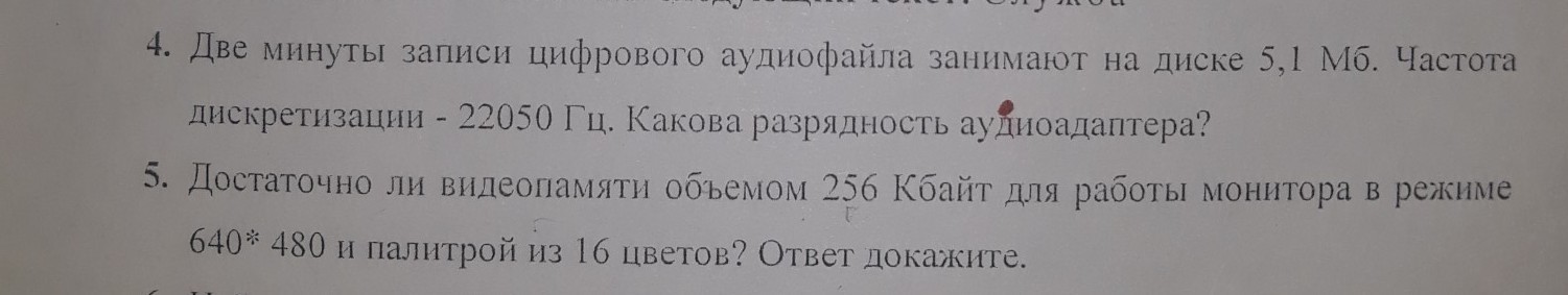 Две минуты записи цифрового аудиофайла занимают на диске 5,1 Мб. Частота дискретизации — 22050 Гц. Какова разрядность аудиоадаптера?