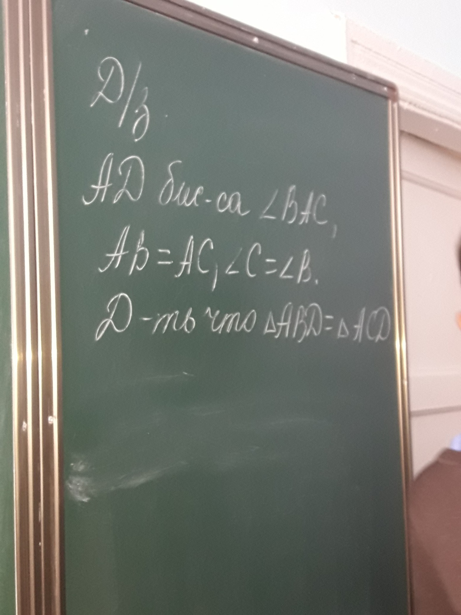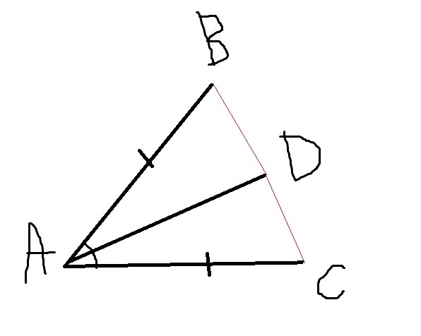 У обоих треугольников есть общая сторона - AD. По условию задачи AB=AC, значит у наших треугольников уже по две одинаковые стороны. Угол С равен углу В, значит у обоих треугольников есть схожие углы(их градусная мера). В итоге мы имеем два треугольника у которых есть по паре равных сторон и прилегающие к ним одинаковые углы. По 1 Теореме, эти углы равны, что и требовалось доказать.
