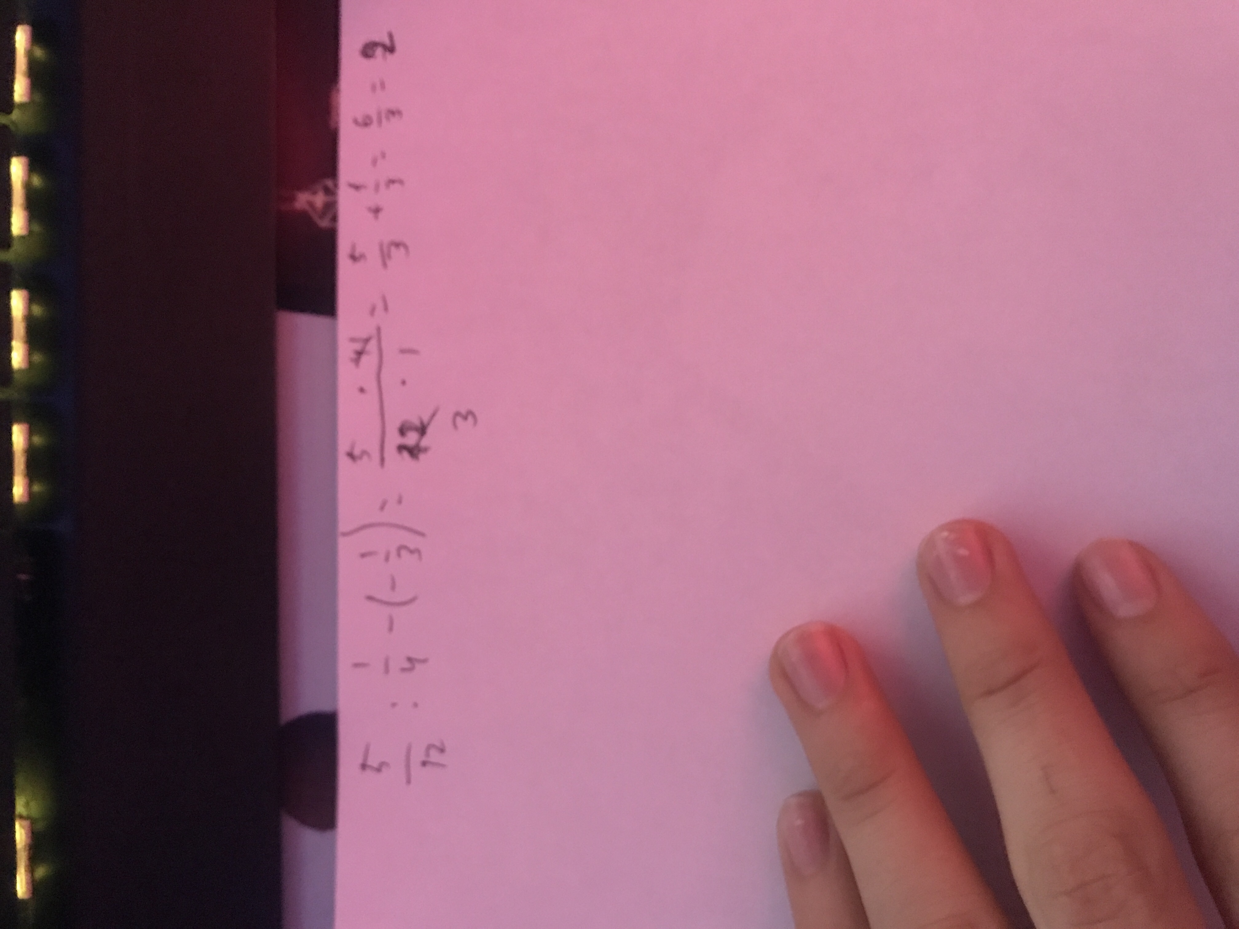 5/12 : 1/4 - (-1/3)= 5/12*4/1+1/3=5/3+1/3=6/3=2