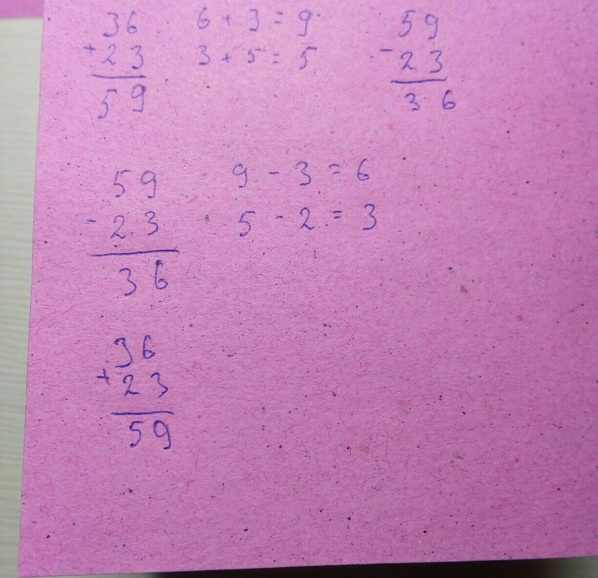 36+23 = 59 , 59-23 = 36 . Проверка: 59-36 = 23 , 23+36= 59