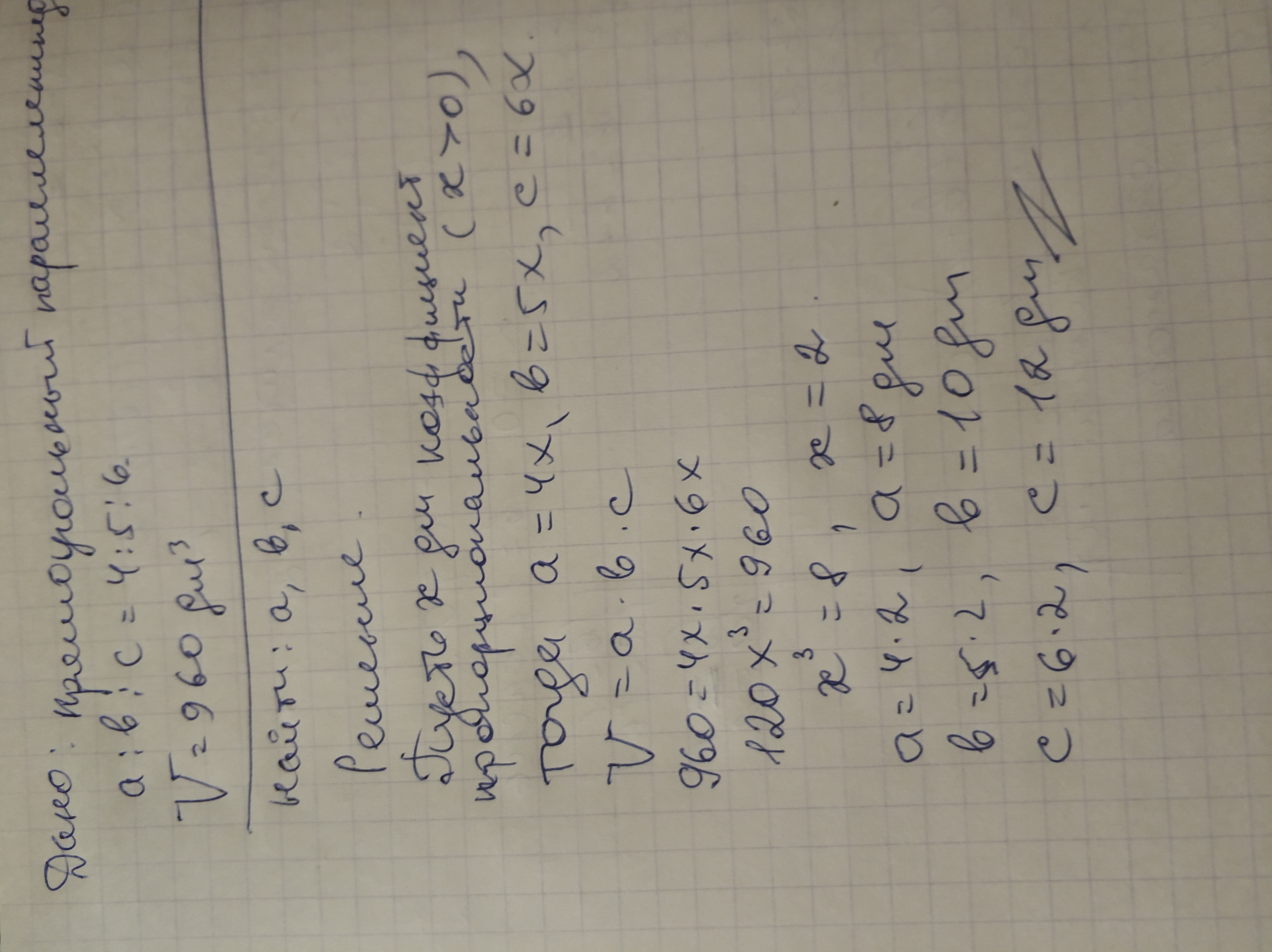 Измерения прямоугольного параллелепипеда относятся как 4:5:6 Узнай измерения прямоугольного параллелепипеда, если его объём равен 960дм3