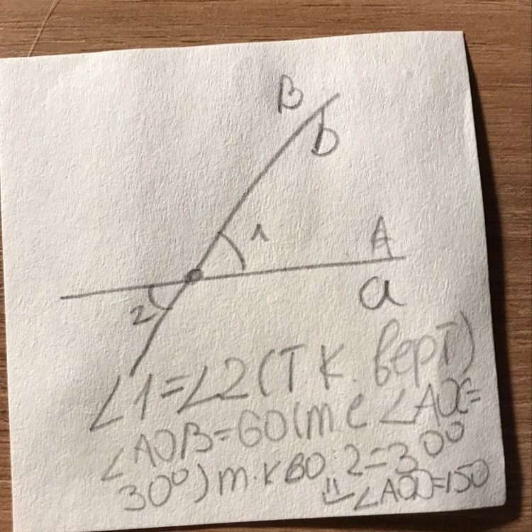 Обозначим прямую b, как AB, прямую a, как СD. Угол AOC=30° т.к. 60/2=30, следовательно угол AOD=180-30=150.