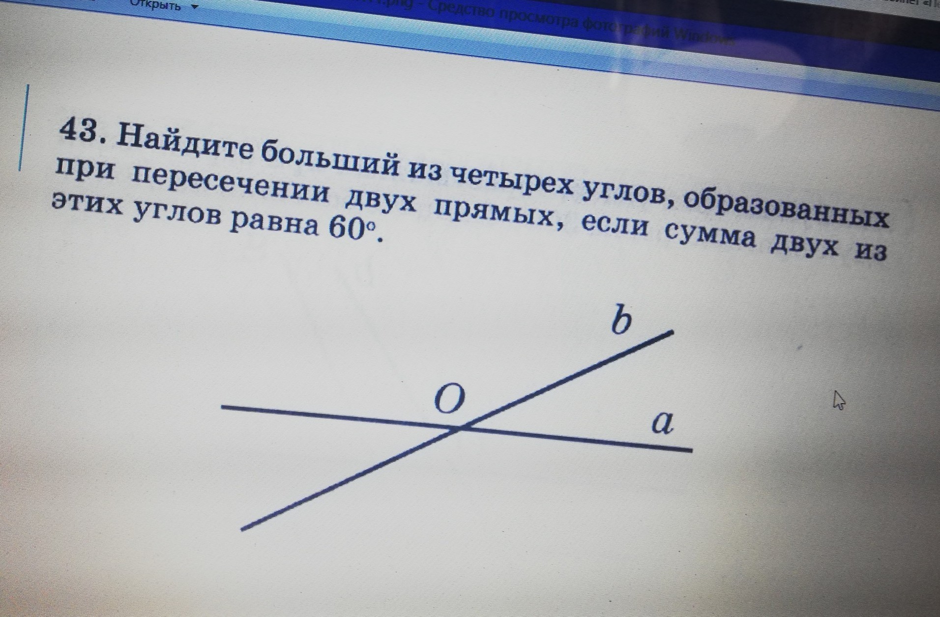 Найдите больший из четырех углов образованных при пересечении двух прямых , если сумма двух из этих углов равна 60 °
