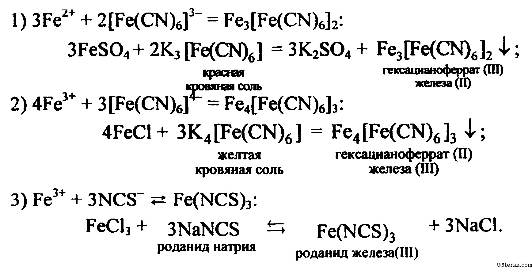 а) 3FeSO4 + 2K3[Fe(CN)6] ⟶ 3K2SO4 + KFe[Fe(CN)6]↓ FeCl2 + K3[Fe(CN)6] ⟶ 2KCl + KFe[Fe(CN)6]↓