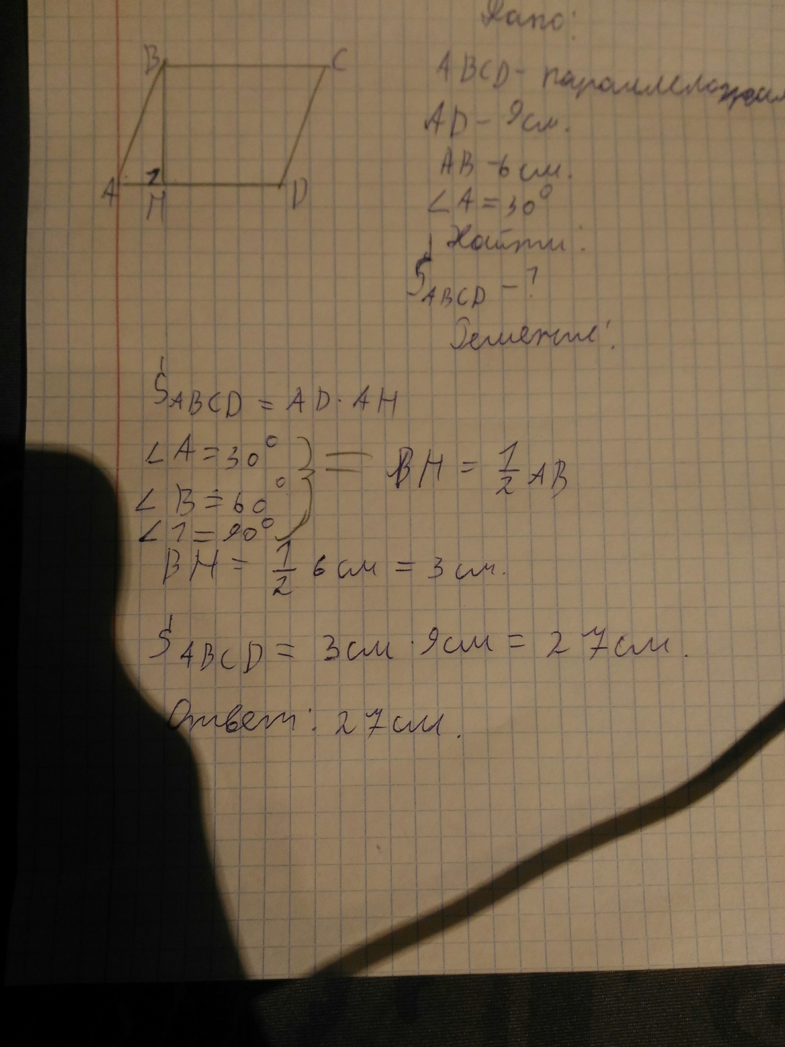 Найдите площадь параллелограмма,если его стороны равны 6 см и 9 см а угол между ними равен 30 градусов