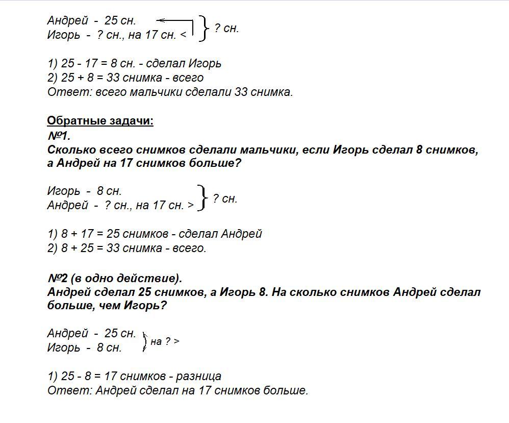 реши задачу.Составь и реши обратные.Андрей сделал 25 снимков одноклассников,а Игорь -на 17 меньше.Сколько всего снимков сделали мальчики?Измени вопрос так,чтобы задача решалась а одно действие.