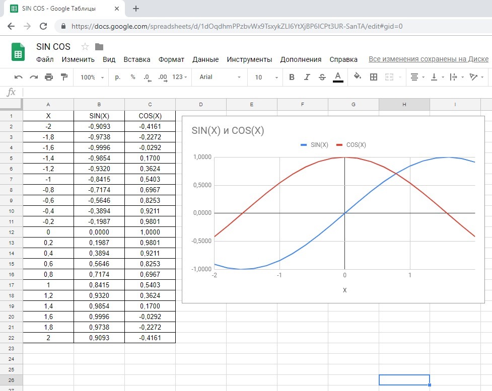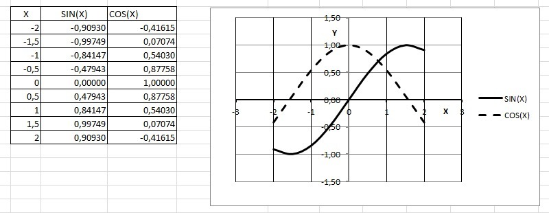 Табулируем функции, т.е. строим таблицу значений функций y = sin(x) и y = cos(x) в указанном диапазоне с шагом табуляции = 0,2.