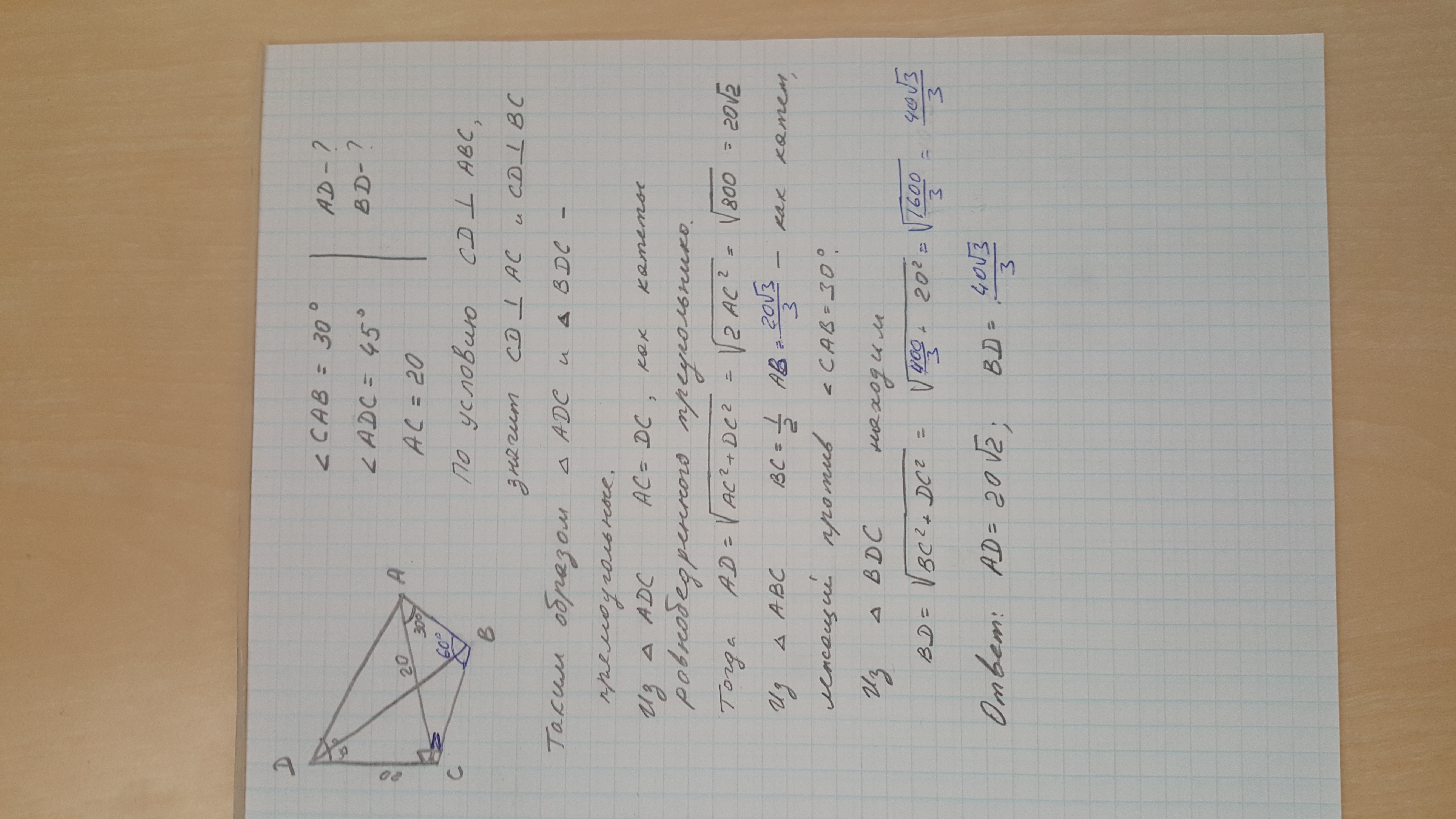 Из ΔACD: ∠ADC =45° ⇒ ∠DAC =90° - ∠ADC =90° - 45°= 45° , поэтому прямоугольный треугольник ACD еще и равнобедренный CD = CA =20 . AD =√(CA²+CD²) = √(CA²+CA²) =√(2CA²) =CA√2 = 20√2 .
