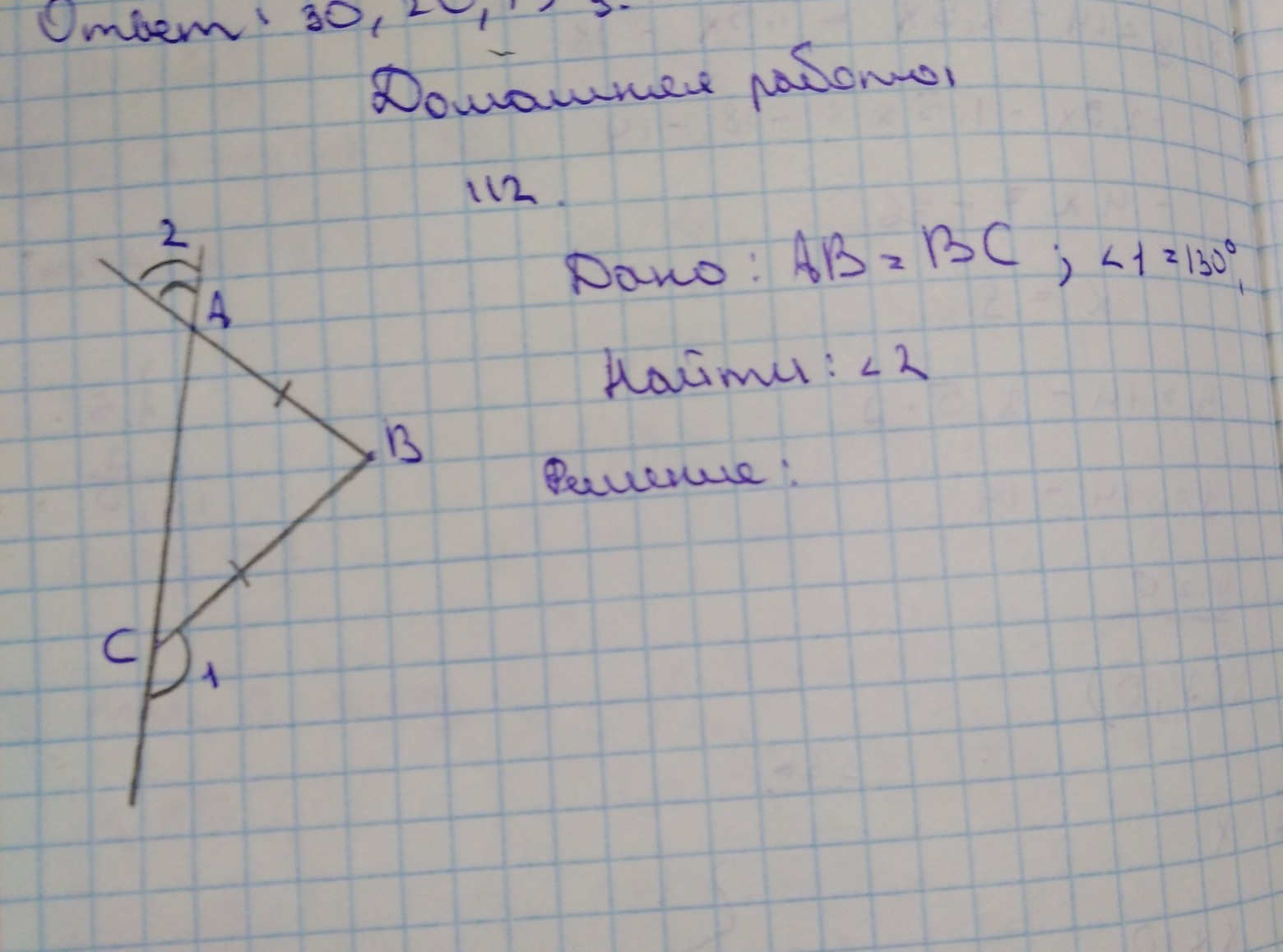 ну смотри нам дано что AB = BC внешний угол С равен 130 , а если сторона AB и CB равны , то внешний угол А тоже будет 130 , получается следствие ->