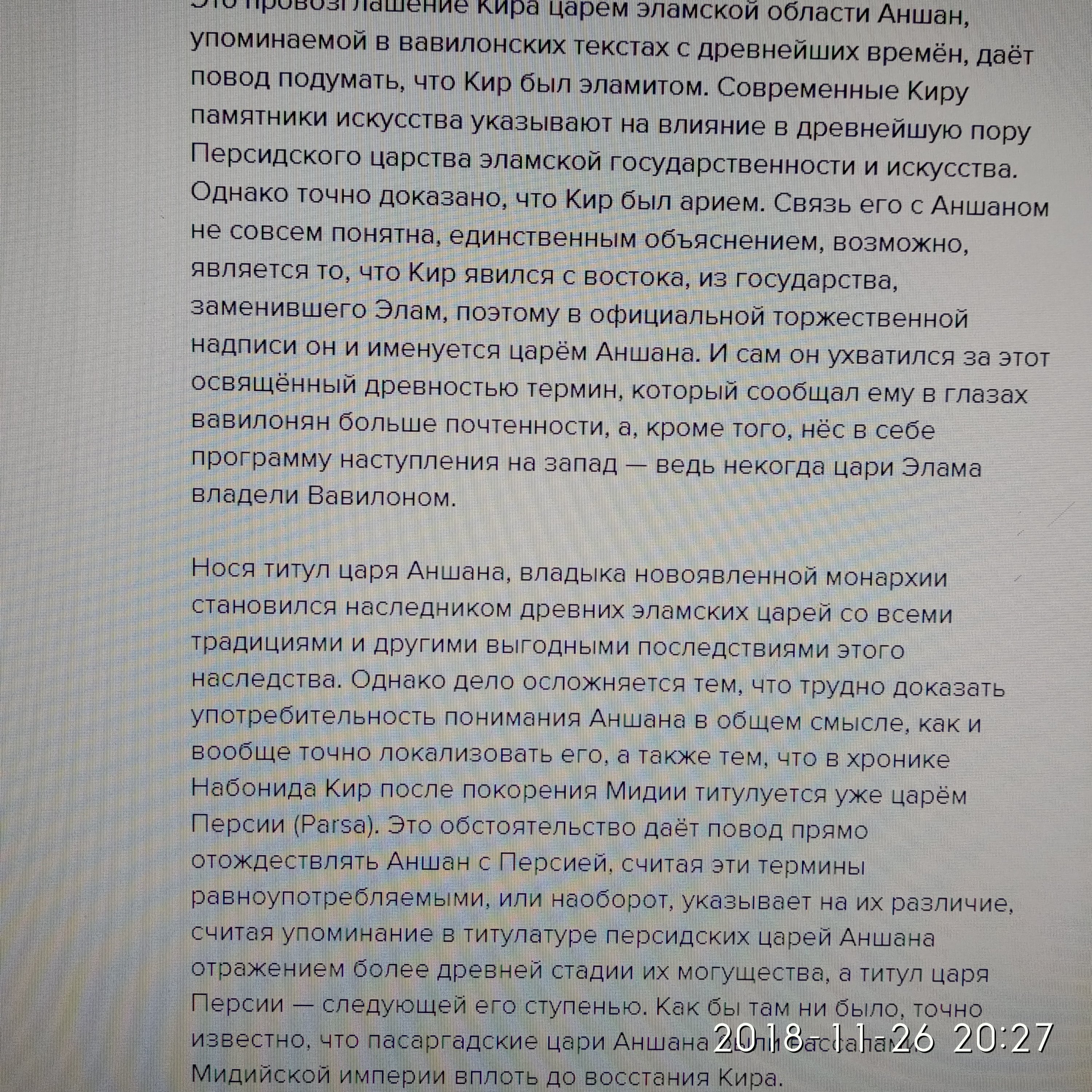 Это провозглашение Кира царём эламской области Аншан, упоминаемой в вавилонских текстах с древнейших времён, даёт повод подумать, что Кир был эламитом. Современные Киру памятники искусства указывают на влияние в древнейшую пору Персидского царства эламской государственности и искусства. Однако точно доказано, что Кир был арием. Связь его с Аншаном не совсем понятна, единственным объяснением, возможно, является то, что Кир явился с востока, из государства, заменившего Элам, поэтому в официальной торжественной надписи он и именуется царём Аншана. И сам он ухватился за этот освящённый древностью термин, который сообщал ему в глазах вавилонян больше почтенности, а, кроме того, нёс в себе программу наступления на запад — ведь некогда цари Элама владели Вавилоном.