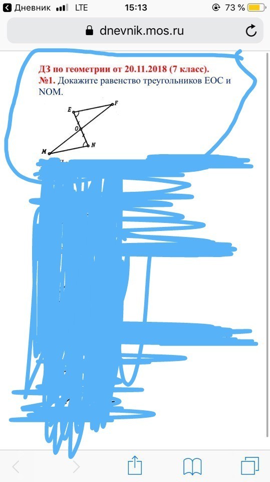 Треугольник EOF равен треугольнику NOM, т.к. OE=ON, угол FEO=MNO по условию, угол FOE равен углу NOM как вертикальные, поэтому