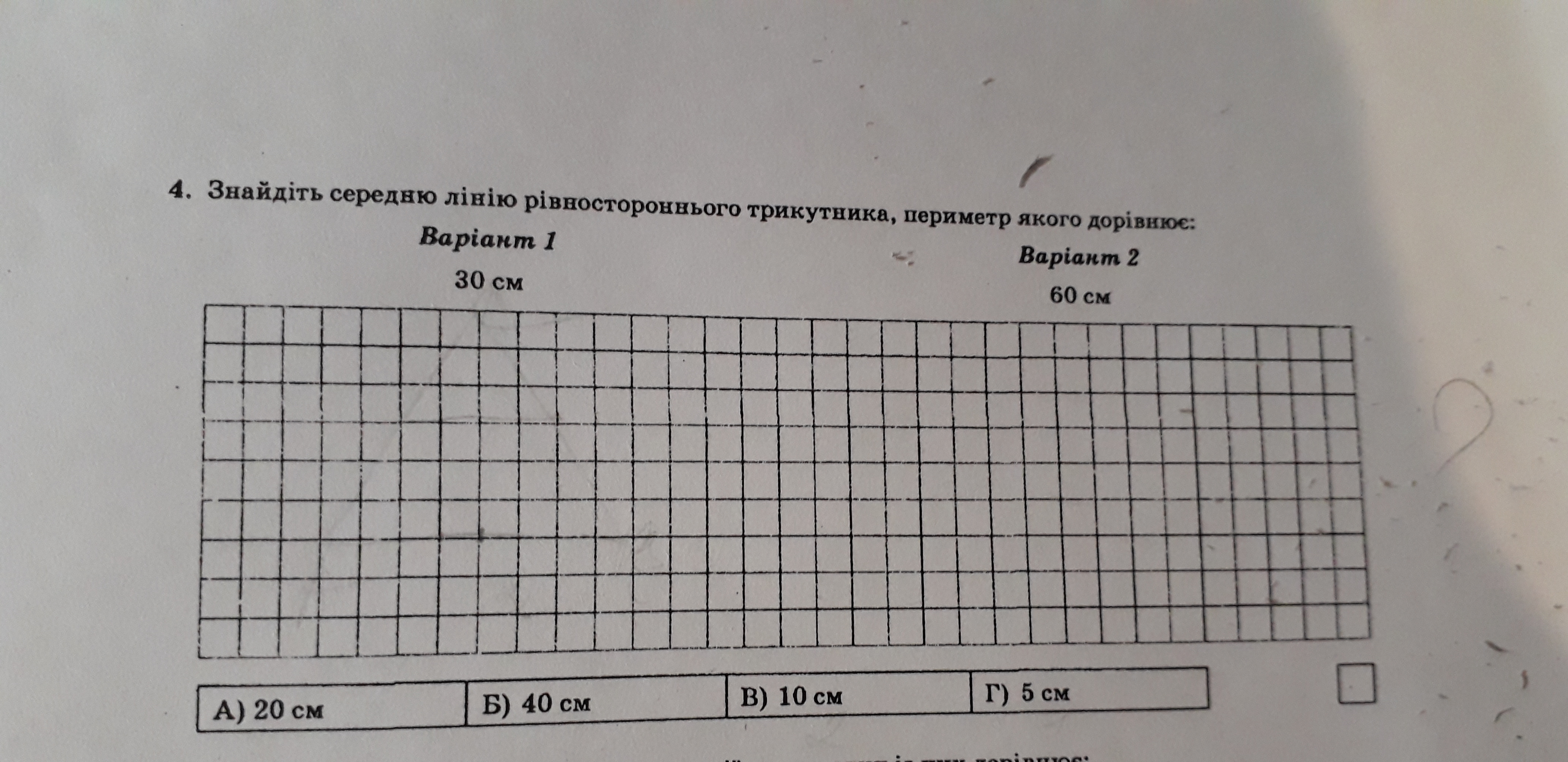 В варианте 1 - 5 см (средняя линия = половине стороны, к которой паралельна) Сторона=30:3=10. 1/2*10=5