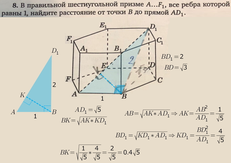 В правильной шестиугольной призме A...F1 все рёбра которой равны 1, найдите расстояние от точки B до прямой AD. Чертёж выше.